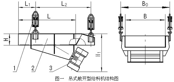 其結構如圖一、二所示:主要有:1、減振器;2、槽體;3、振動電機三部分組成,給料機采用兩臺同一規格的振動電機為激振源。